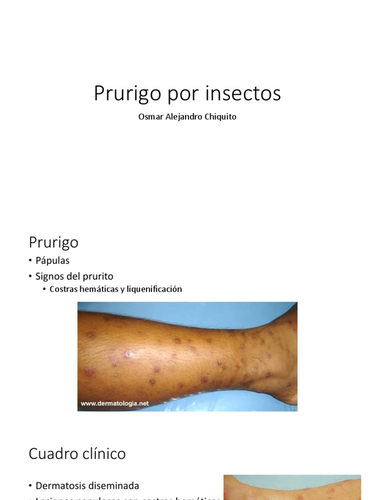 Prurigo por insectos - SlideShare PRÚRIGO POR INSECTOS Definición El prurigo infantil es una dermatosis reaccional producida por la picadura de insectos, de curso crónico, pero benigno y que generalmente se autolimitan en el tiempo. BALLONA, Rosalía. Prurigo infantil. Folia dermatológica peruana. 19 (3): 149, 2008. 4. PDF Dermatología PRURIGO POR INSECTOS DEFINICION El prurigo por insecto es una manifestación cutánea producida por la sensibilización a los angenos salivales que se inoculan durante la picadura de diversos artrópodos: insectos y arácnidos. La palabra prurigo proviene del lan proorigo, cuyo significado literal es comezón. Prurigo por insectos. - slideshare.net PRURIGO POR INSECTOS Diego Cruz Ruiz DERMATOLOGIA 2. Dermatosis reaccional a la picadura de insectos, que por lo general afecta a niños. Las lesiones son pápulas, ronchas y costras hemáticas en la región lumbar, nalgas y caras externas de extremidades. La originan chinches y con menor frecuencia otros ectoparásitos. Escabiosis, pediculosis, purigo por insectos PRURIGO POR INSECTOS. Picaduras se encuentran en áreas expuestas Mosquito culícido 20. PULGAS. Se deben sobre todo a las pulgas de perros y gatos Viven en alfombras y tapetes Saltan cuando perciben la vibración de los pasos Picaduras pequeñas y pruriginosas, se encuentran mayormente en las piernas. 21. CUADRO CLÍNICO.