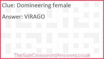 Domineering female crossword clue - TheSunCrosswordAnswers.co.uk Domineering female Domineering female Domineering female is a crossword clue for which we have 1 possible answer and we have spotted 1 times in our database. This crossword clue was last seen on 01 August 2022 in The Sun Coffee Time Crossword puzzle! Possible Answer V I R A G O Last Seen Crosswords The Sun Coffee Time Crossword Last Seen Dates